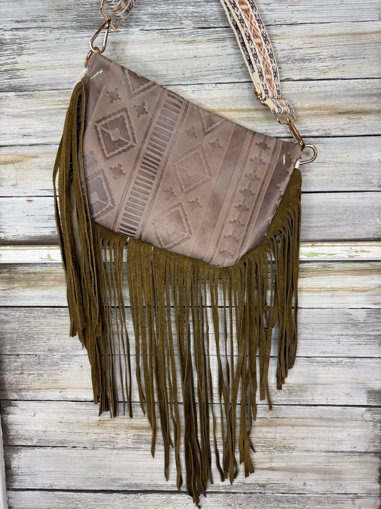 This is our classic sized, small bumbag style Frannie bag with fringe!