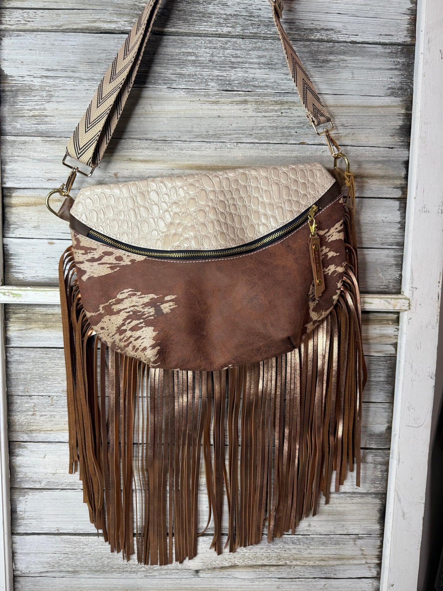 Brown Acid Wash Cowhide and Pearl Embossed Leather Frannie XL w Fringe