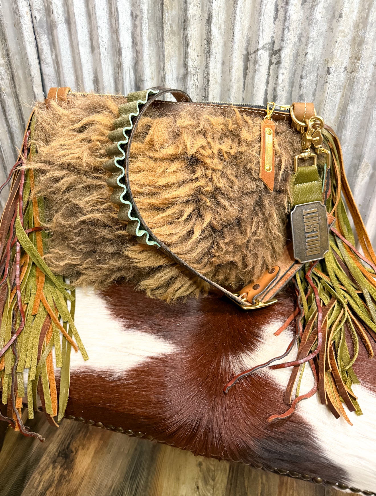 Stunning brown and green buffalo bag. Multi colored and signature “curly” fringe. Inside and outside pocket. Vintage brass belt buckle bag charm. (Removable)14x10x4